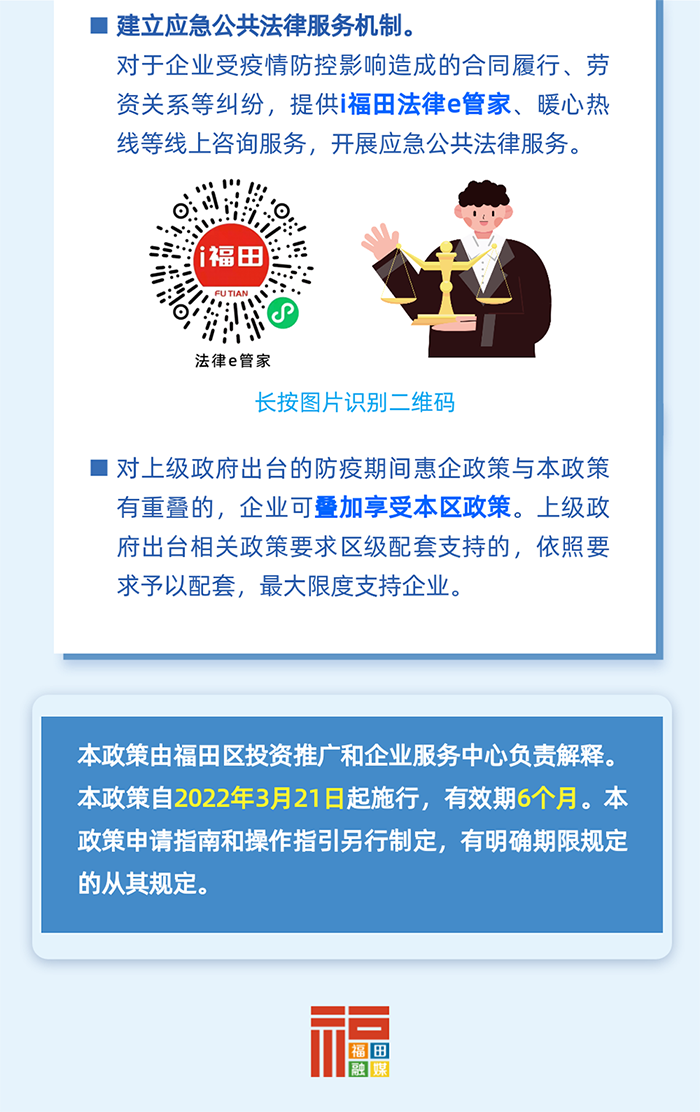 開展專項法律援助。建立應急公共法律服務機制,對于企業受疫情防控影響造成的合同履行、勞資關系等糾紛,設立專線提供應急公共法律咨詢服務。(牽頭單位:區司法局)